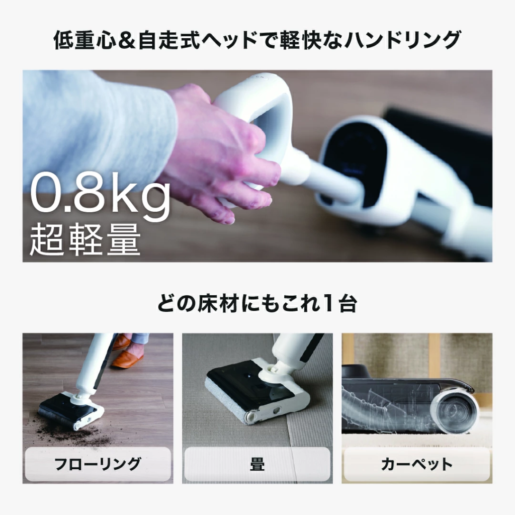 「片手でスイスイ持ち上げられる重さではない」「2階への持ち運びが少し大変」という声があります。 水を入れるタンクを搭載しているため、どうしても重量はあります。ただし、電源を入れると自走式ヘッドがグイグイ前に進んでくれるため、掃除中の手首への負担は驚くほど軽いです。