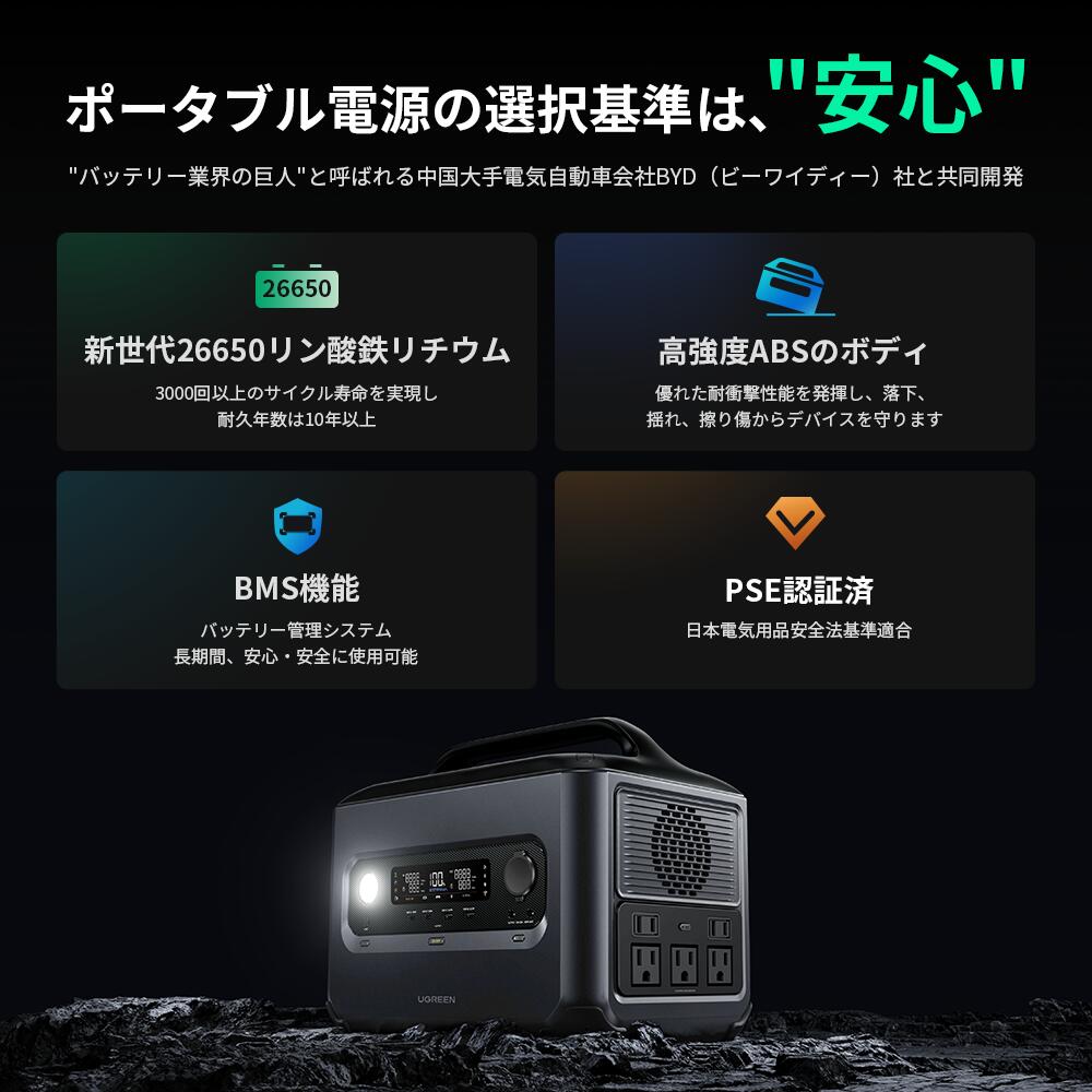 「BYD製のリン酸鉄リチウムイオン電池を採用しているから安心。5年保証がついているのが決め手になった。」 (出典:楽天市場 UGREEN公式店舗レビューより要約) 世界的なEVメーカーであるBYD社との共同開発という背景が、安全性への高い信頼に繋がっています。