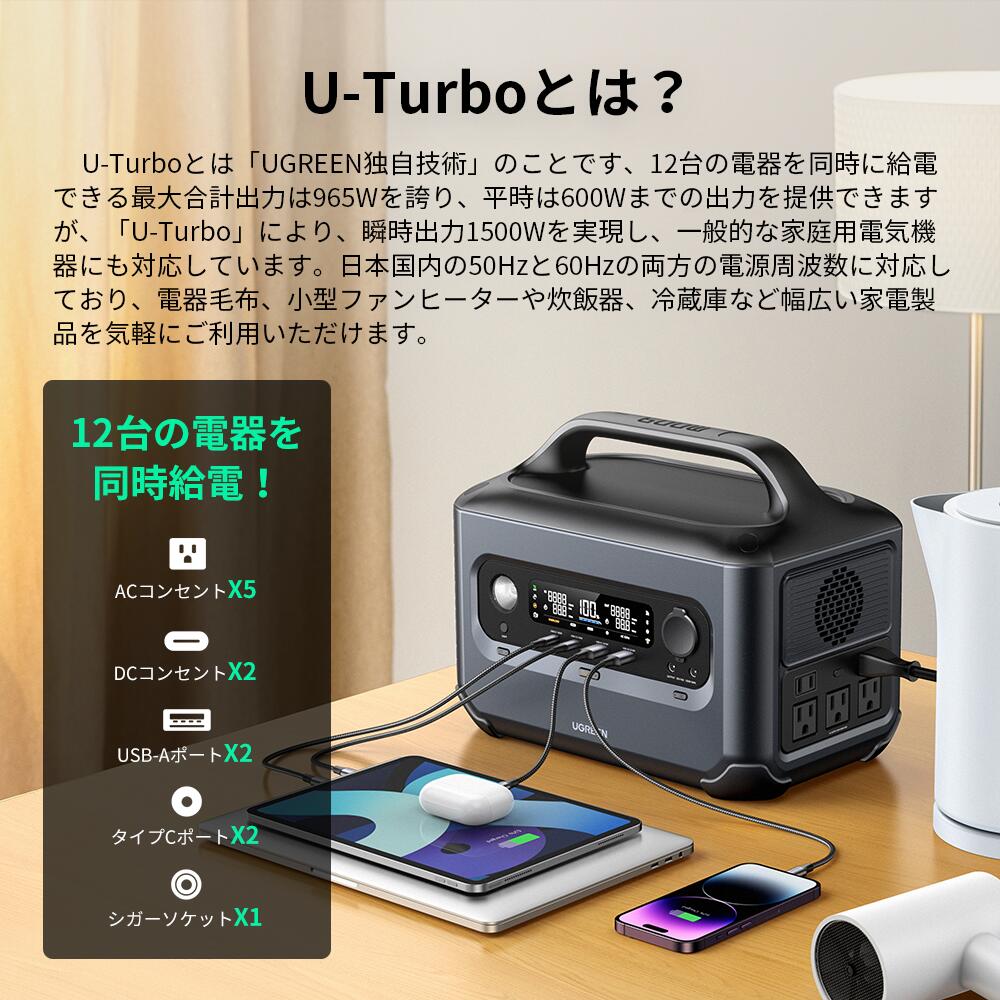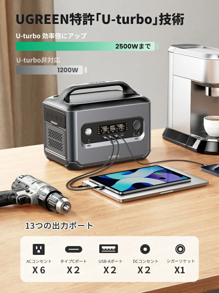 ポータブル電源選びで失敗しがちなのが「買ってみたらドライヤーが使えなかった」というケースです。 UGREENの「U-Turbo技術」は、定格出力を超える高出力家電の電圧を自動で制御し、稼働させることができる画期的な機能です。例えば、定格600Wの小型モデル(PowerRoam 600)でも、最大1,500Wまでの家電(ドライヤーや電気ケトルなど)を動かすことが可能になります。「大出力の家電を使いたいから、高額で重い大型機を買わなければならない」という常識を覆します。